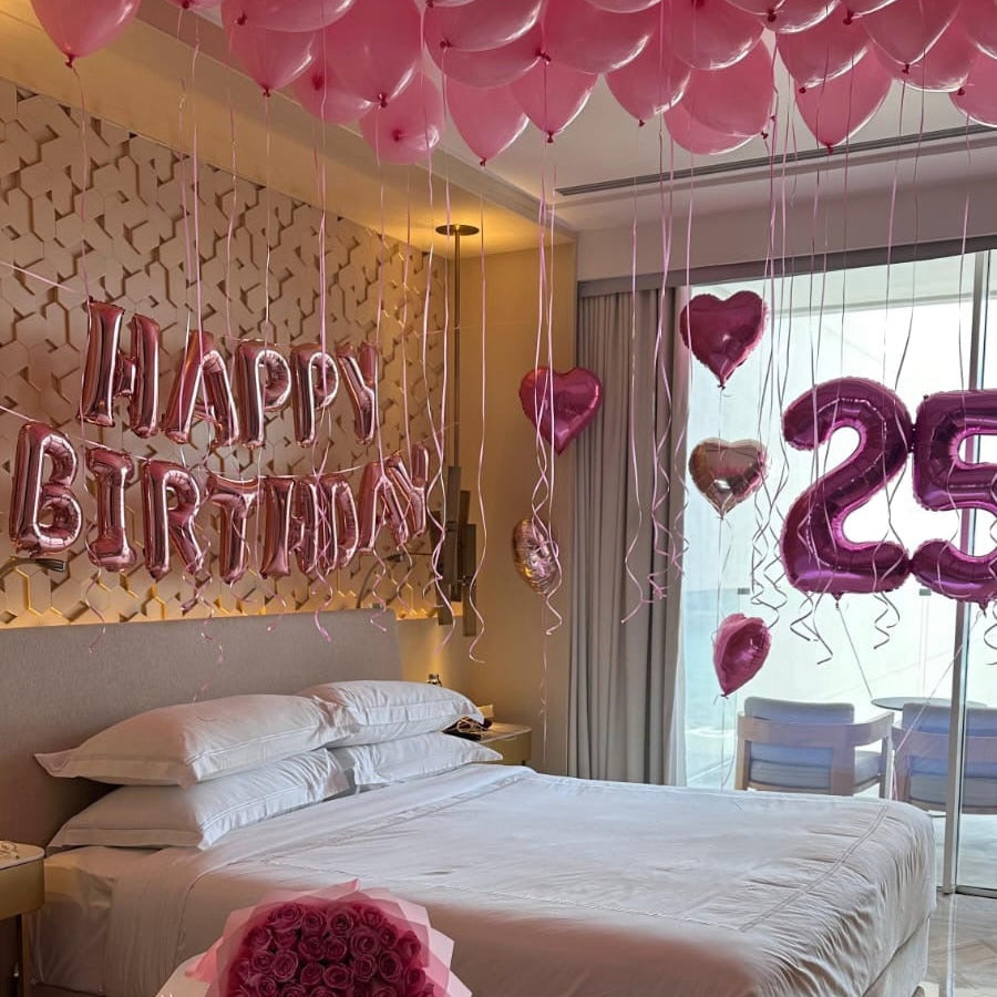 An upgrade of the Her Birthday Package, this elevated options combines our most popular styles with the addition of the Heart Wall Package and a bouquet of 50 roses.