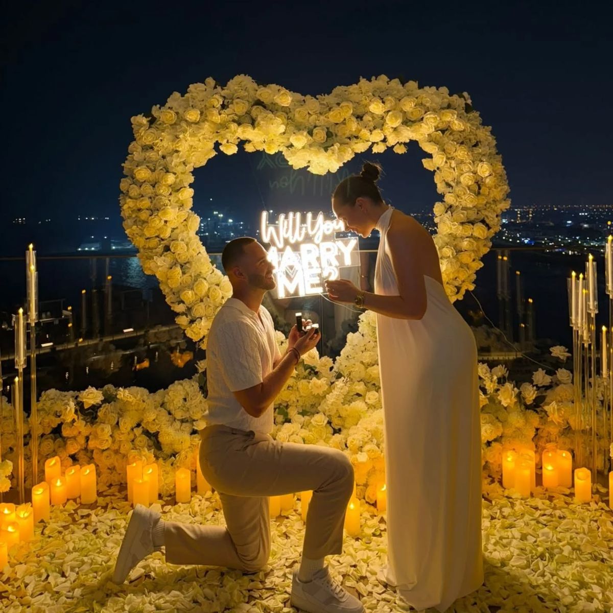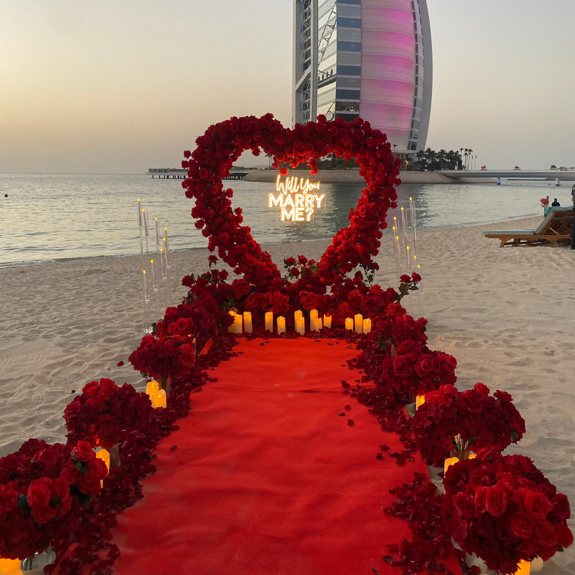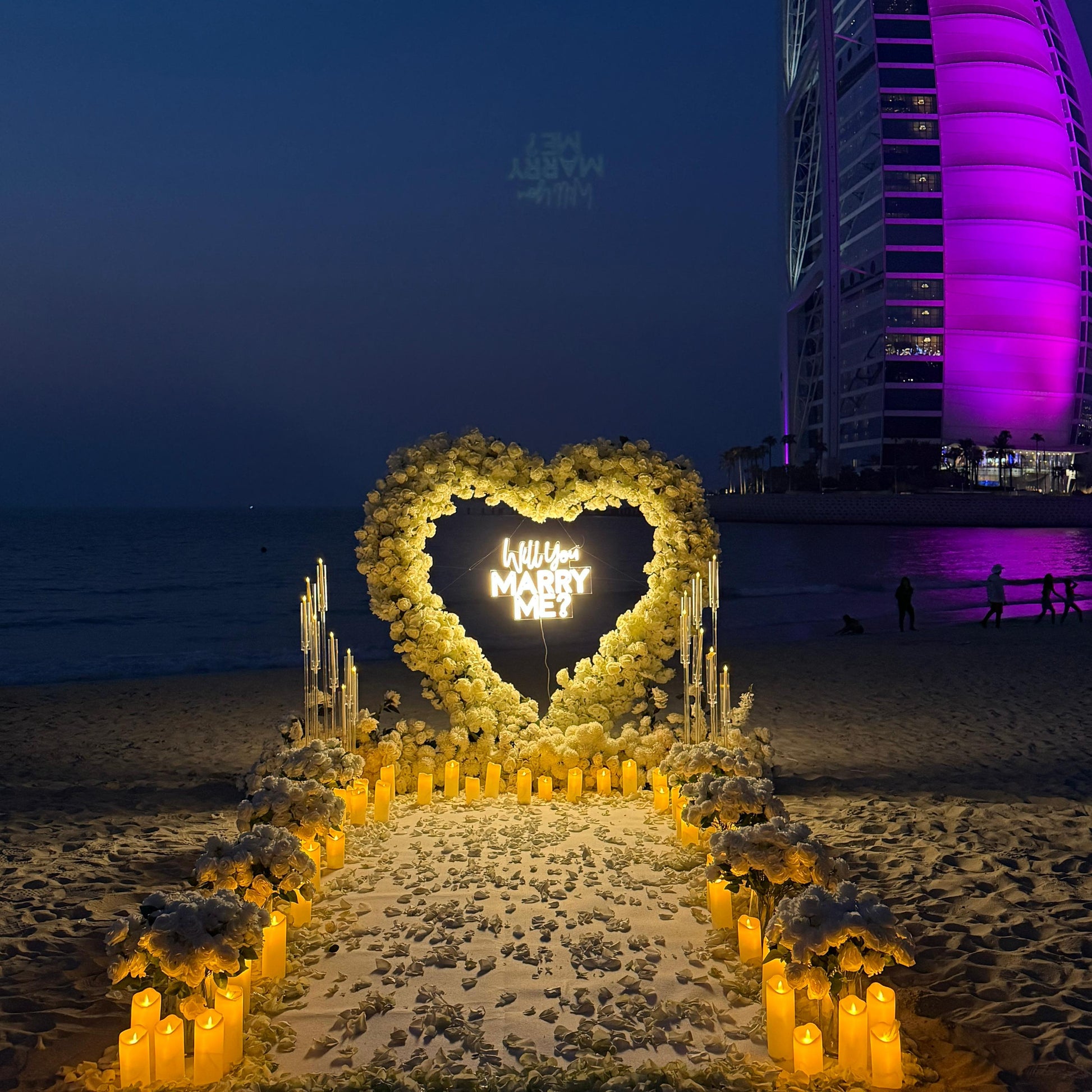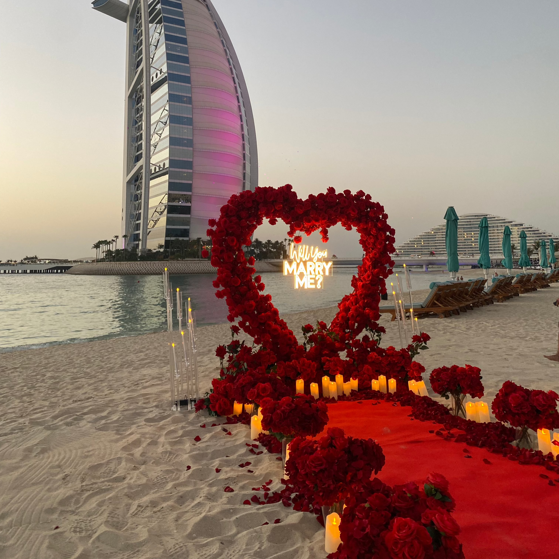 Ready to propose in unforgettable Dubai style? Our Dubai Proposal Package is a luxurious, fully-styled setup designed to create the most romantic, picture-perfect moment of your life — whether it's on the beach, a private rooftop, hotel room, or in a dreamy garden setting.
